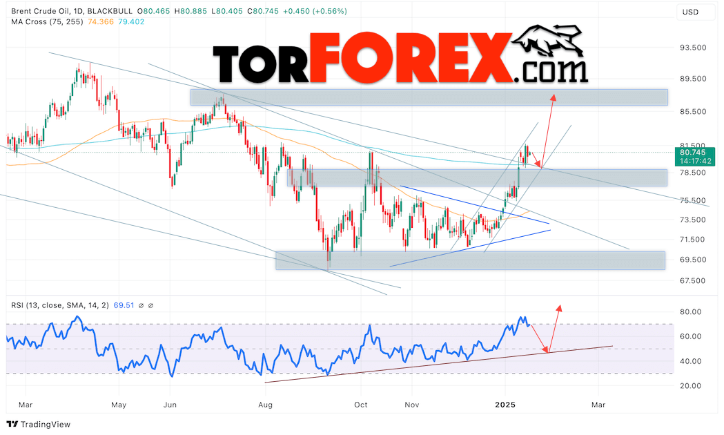 Таким образом, Brent прогноз нефти на 20 — 24 января 2025 предполагает попытку развития медвежьей коррекции и тестирование уровня поддержки на отметке 78.65 долларов за баррель. Затем, ожидается продолжение роста нефти с целью выше уровня 86.85. Тест линии тренда на индикаторе относительной силы (RSI) будет подтверждать подъём стоимости актива. Альтернативный сценарий, который предполагает падение цены нефти Brent на следующей торговой неделе, наступит при пробое уровня 76.05, что укажет на дальнейшее понижение котировок к уровню 73.05.