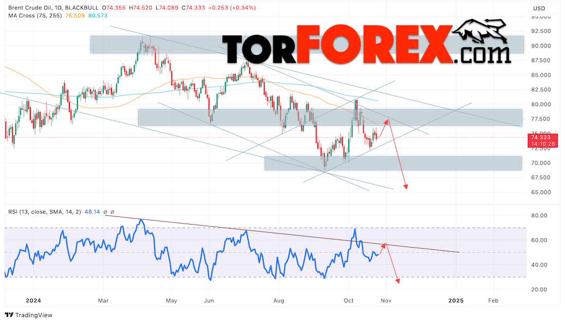Дополнительным сигнал в пользу снижения котировок нефти Brent станет тест линии сопротивления на индикаторе относительной силы (RSI). Вторым сигнал выступит отбой от верхней границы медвежьего канала. Нисходящий сценарий по нефти отменяется при пробое уровня 81.75 долларов за баррель, что укажет на пробой области сопротивления и продолжение роста котировок Brent к отметке 85.65. Подтверждением падению котировок станет пробой области поддержки и закрытие цен на Brent ниже отметки 70.35, что укажет на пробой нижней границы бычьего канала коррекции.