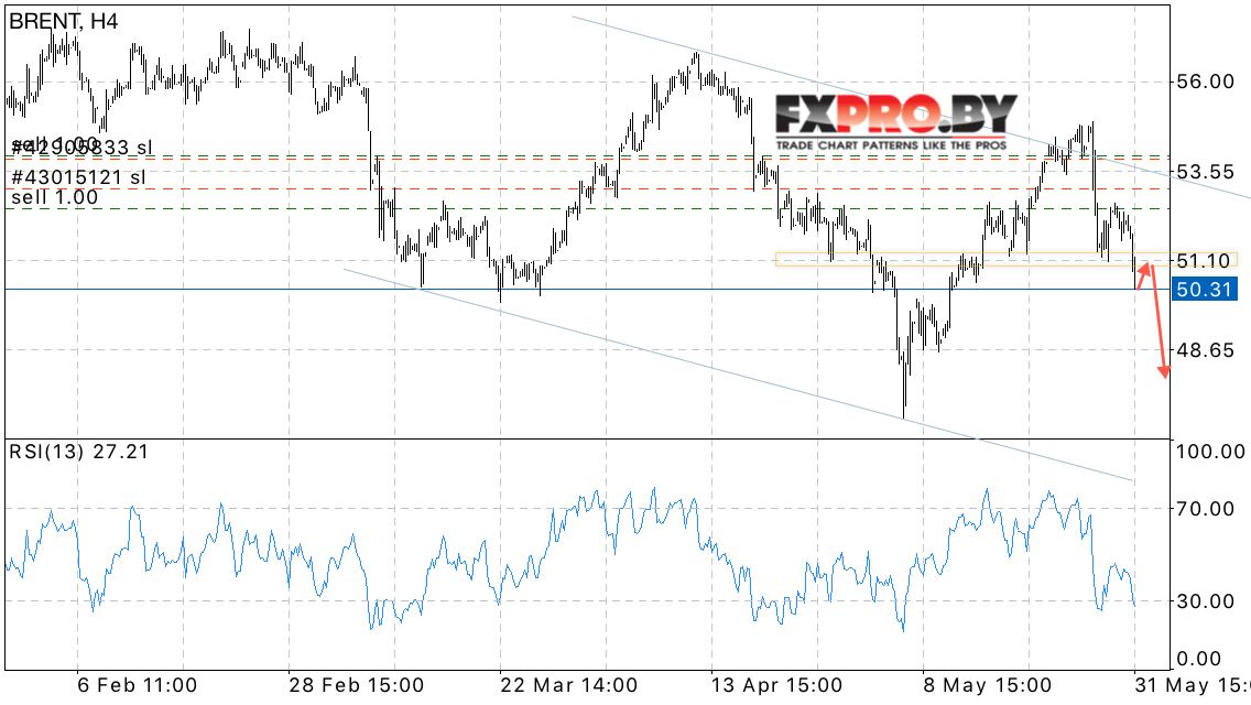 Таким образом, BRENT прогноз цен на нефть на 1 июня 2017 предполагает попытку продолжения снижения котировок нефти в область ниже уровня 48 долларов за баррель в рамках отработки Форекс модели Голова и плечи, отменой станет пробой области 52.