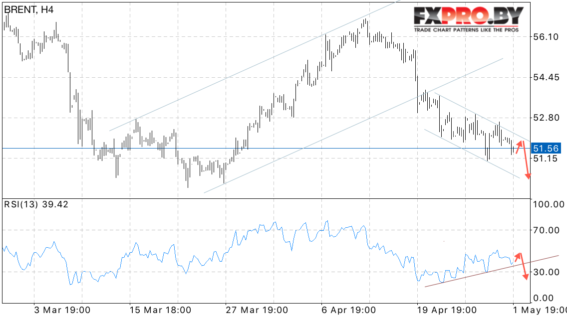 Таким образом, BRENT прогноз цен на нефть на 2 мая 2017 предполагает попытку падения цен на нефть в область ниже уровня 51 доллар за баррель в рамках отскока от верхней границы нисходящего канала.
