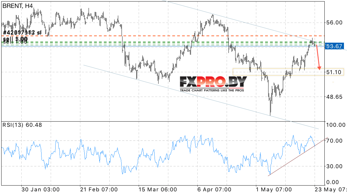 Таким образом, BRENT прогноз цен на нефть на 24 мая 2017 предполагает попытку отскока от верхней границы нисходящего канала с потенциальной целью снижения на уровне 51 доллар за баррель, отменой может стать пробой границы канала и закрытие котировок выше уровня 55 долларов, в этом случае стоит ожидать продолжения роста.
