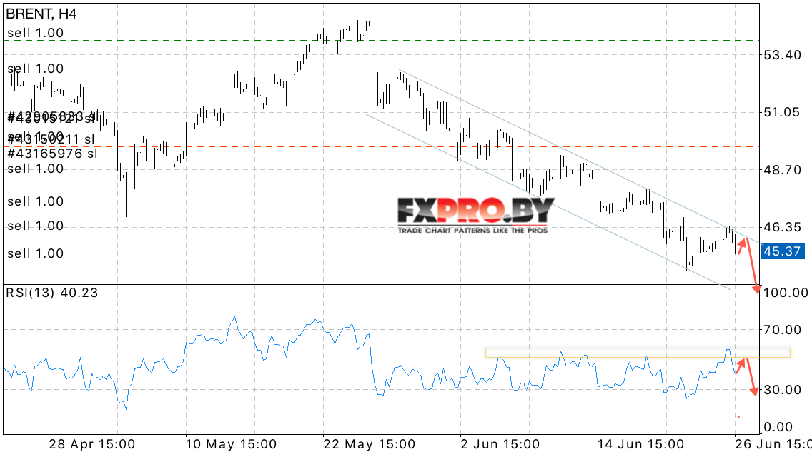 Таким образом, BRENT прогноз цен на нефть на 27 июня 2017 предполагает попытку продолжения снижения в рамках отскока от верхней границы нисходящего канала, дополнительным сигналом выступает тест области сопротивления на индикаторе относительной силы.