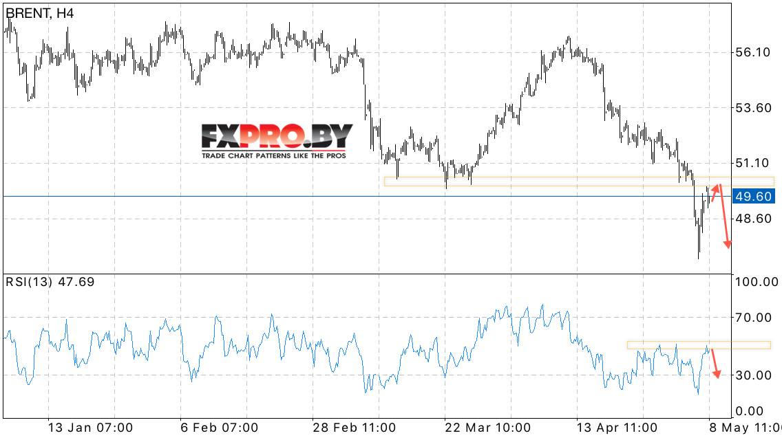 Таким образом, BRENT прогноз цен на нефть на 9 мая 2017 предполагает попытку теста области сопротивления и продолжения падения котировок и цен на нефть в область ниже уровня 47 долларов за баррель, отменой станет пробой области 50.50 долларов.