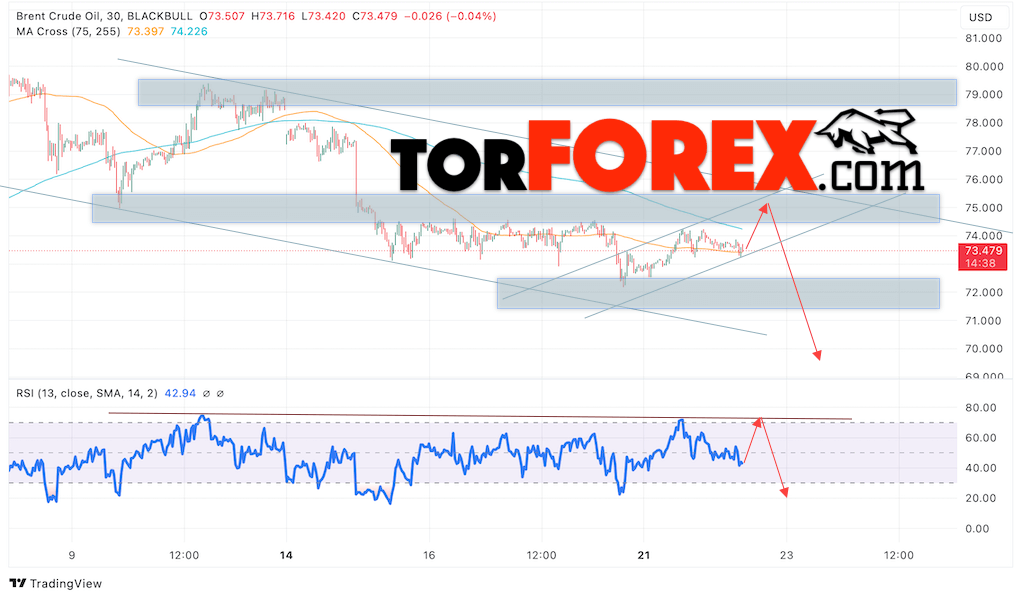 Дополнительным сигналом в пользу снижения котировок нефти Brent станет тест нисходящей линии тренда на индикаторе относительной силы (RSI). Вторым сигнал выступит отбой от верхней границы медвежьего канала. Медвежий сценарий по нефти отменяется при пробое уровня 76.65 долларов за баррель, что укажет на пробой области сопротивления и продолжение роста котировок Brent к отметке 81.75. Подтверждением падению котировок станет пробой области поддержки и закрытие цен на Brent ниже отметки 72.95, что укажет на пробой нижней границы бычьего канала коррекции.