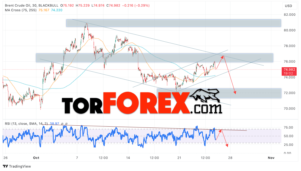 Дополнительным сигналом в пользу снижения котировок нефти Brent станет тест нисходящей линии тренда на индикаторе относительной силы (RSI). Вторым сигнал выступит отбой от верхней границы медвежьего канала. Медвежий сценарий по нефти отменяется при пробое уровня 77.65 долларов за баррель, что укажет на пробой области сопротивления и продолжение роста котировок Brent к отметке 83.55. Подтверждением падению котировок станет пробой области поддержки и закрытие цен на Brent ниже отметки 73.35, что укажет на пробой нижней границы бычьего канала коррекции.