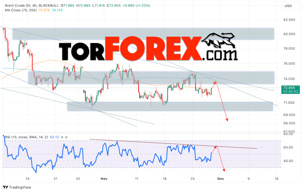 Дополнительным сигналом в пользу снижения котировок нефти Brent станет тест линии тренда на индикаторе относительной силы (RSI). Вторым сигнал выступит отбой от верхней границы нисходящего канала. Медвежий сценарий по нефти отменяется при пробое уровня 75.65 долларов за баррель, что укажет на пробой области сопротивления и продолжение роста котировок Brent к отметке 80.05. Подтверждением падению котировок станет пробой области поддержки и закрытие цен на Brent ниже отметки 71.05.