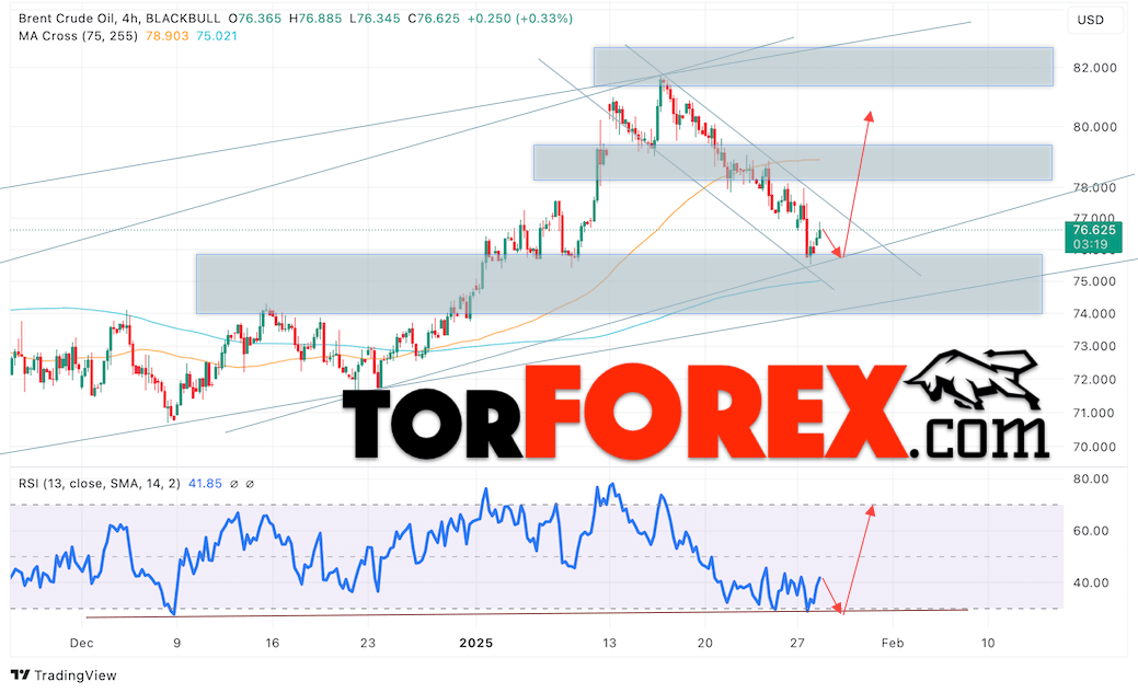 Таким образом, Нефть прогноз цены Brent на 29 января 2025 предполагает тестирование уровня поддержки на отметки 75.45 долларов за баррель. Затем, ожидается продолжение роста нефти с целью выше уровня 80.75. Отбой от линии тренда на индикаторе относительной силы (RSI) будет подтверждать подъём стоимости актива. Альтернативный сценарий, который предполагает падение цены нефти Brent, наступит при пробое уровня 74.25, что укажет на дальнейший снижения котировок к уровню 69.05.