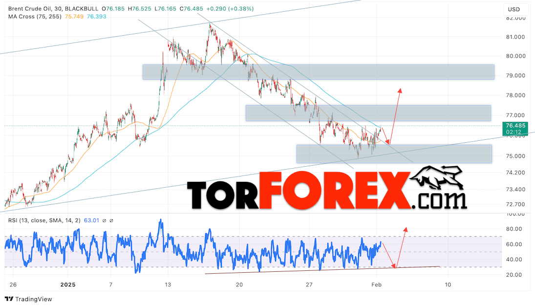 Таким образом, Нефть прогноз цены Brent на 4 февраля 2025 предполагает тестирование уровня поддержки на отметки 75.05 долларов за баррель. Затем, ожидается продолжение роста нефти с целью выше уровня 78.25. Отбой от бычьей линии тренда на индикаторе относительной силы (RSI) будет подтверждать рост стоимости актива. Альтернативный сценарий, который предполагает падение цены нефти Brent, наступит при пробое уровня 74.05, что укажет на дальнейший снижение котировок к уровню 69.05.