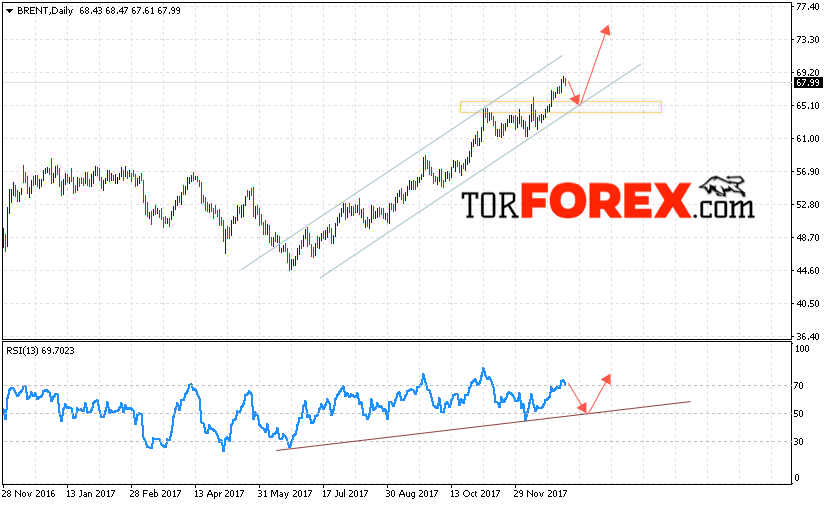 Таким образом, Прогноз цен на нефть BRENT на 8 — 12 января 2018 предполагает попытку теста нижней границы канала вблизи уровня 65.70, откуда стоит ожидать отскок и попытку продолжения роста нефти с потенциальной целью на уровне 73.50, дополнительным сигналом в пользу роста цены нефти выступит тест линии поддержки на индикаторе относительной силы, отменой варианта роста станет падение и пробой области 63.50.