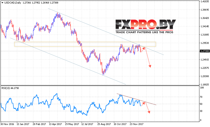 Таким образом, USD/CAD прогноз FOREX на 25 — 29 декабря 2017 предполагает попытку теста верхней границы канала вблизи 1.2800 и продолжения падения с целью ниже 1.2250, дополнительным сигналом в пользу падения выступит тест линии сопротивления на индикаторе относительной силы, а также формирование нисходящей модели «5-0», отменой варианта падения станет пробой области 1.30, что укажет на продолжение роста.