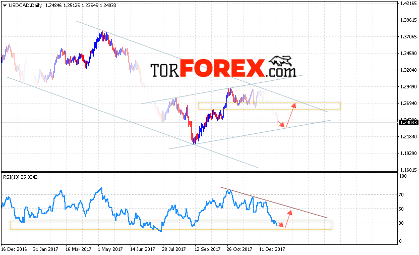 Таким образом, USD/CAD прогноз FOREX на 8 — 12 января 2018 предполагает попытку теста уровня нижней границы канала вблизи 1.2360 и продолжения роста с целью выше 1.2700, дополнительным сигналом в пользу роста выступит тест области поддержки на индикаторе относительной силы, отменой варианта роста станет пробой области 1.2250, что укажет на продолжение падения пары.