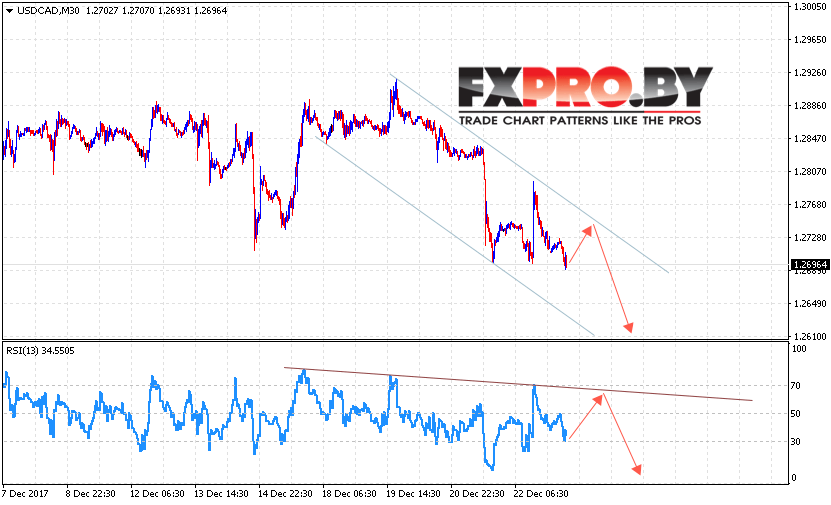 Таким образом, USD/CAD прогноз Канадский Доллар на 27 декабря 2017 предполагает попытку теста уровня 1.2740 и продолжения падения в область ниже уровня 1.2620, дополнительным сигналом в пользу падения выступит тест линии сопротивления на индикаторе относительной силы, отменой варианта падения Канадского Доллара станет пробой уровня 1.2740.