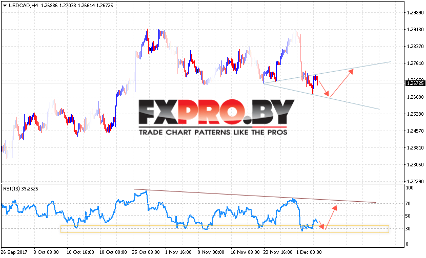 Таким образом, USD/CAD прогноз Канадский Доллар на 7 декабря 2017 предполагает попытку теста уровня поддержки вблизи 1.2610 и продолжения роста в область выше уровня 1.2750, дополнительным сигналом в пользу роста выступит тест области поддержки на индикаторе относительной силы, отменой варианта роста Канадского Доллара станет пробой уровня 1.2530.