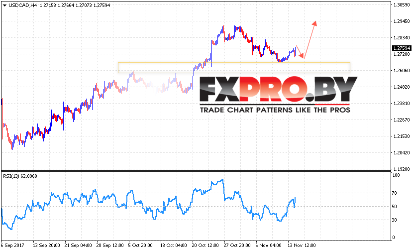 Таким образом, USD/CAD прогноз Канадский Доллар на 15 ноября 2017 предполагает попытку теста уровня 1.2720 в рамках завершения формирования разворотной модели и продолжение роста USD/CAD выше уровня 1.2950, отменой варианта роста станет падение и пробой уровня 1.2580.