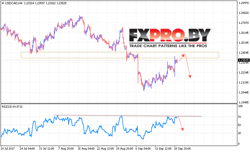 Таким образом, USD/CAD прогноз Канадский Доллар на 22 сентября 2017 предполагает попытку теста уровня сопротивления и продолжения падения с потенциальной целью вблизи 1.22, дополнительным сигналом выступает тест линии тренда на индикаторе относительной силы, отменой падения станет рост выше уровня 1.2550.