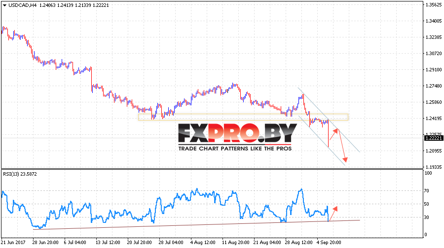 Таким образом, USD/CAD прогноз Канадский Доллар на 7 сентября 2017 предполагает отскок от верхней границы канала и продолжения падения с потенциальной целью на уровне 1.2050, отменой падения выступит пробой уровня 1.25.