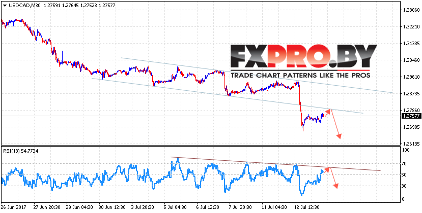 Таким образом, USD/CAD прогноз Канадского Доллара на 14 июля 2017 предполагает попытку продолжения снижения в область ниже уровня 1.26 в рамках отскока от пробитой границы нисходящего канала, отменой выступит пробой области 1.28.