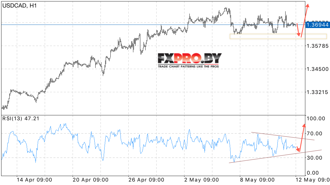 В пользу роста выступит тест нижней границы Форекс модели Треугольник на индикаторе относительной силы. Ожидать ускорения роста котировок USD/CAD стоит с пробоем верхней границы модели Треугольник. Отменой варианта роста пары Канадский Доллар к Доллару США станет падении и пробой области 1.3580.