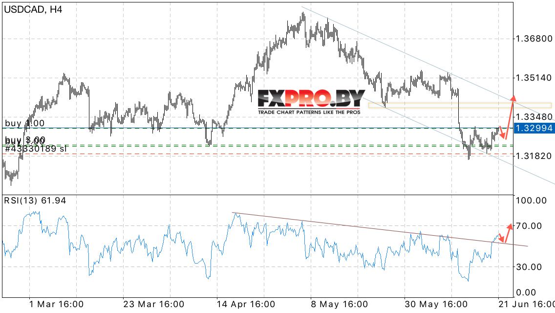 Таким образом, USD/CAD прогноз Канадского Доллара на 22 июня 2017 предполагает попытку роста в область верхней границы нисходящего канала на уровне 1.3350, дополнительным сигналом выступает пробой линии сопротивления на индикаторе относительной силы.