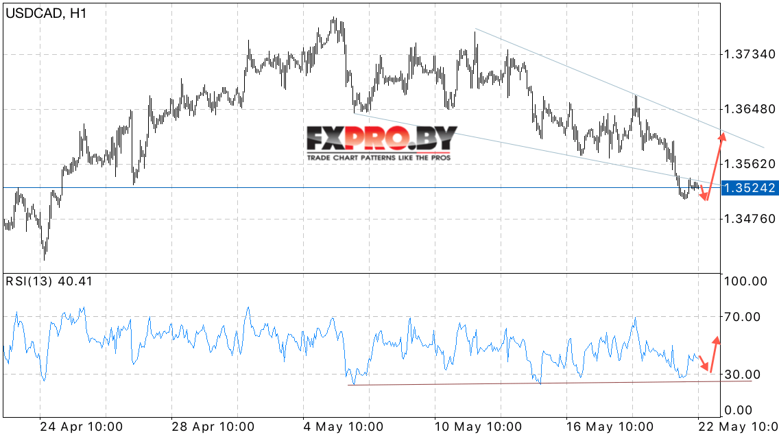 Таким образом, USD/CAD прогноз Канадского Доллара на 23 мая 2017 предполагает попытку возврата котировок внутрь модели Клин и начала роста с первой целью на уровне 1.3630, отменой станет пробой области 1.3480.