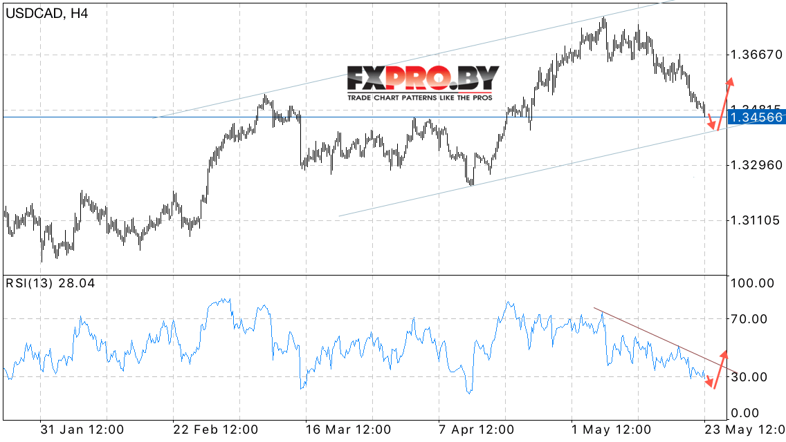 Таким образом, USD/CAD прогноз Канадского Доллара на 24 мая 2017 предполагает попытку теста нижней границы восходящего канала, откуда стоит ожидать отскок и рост пары, отменой станет пробой области 1.34.