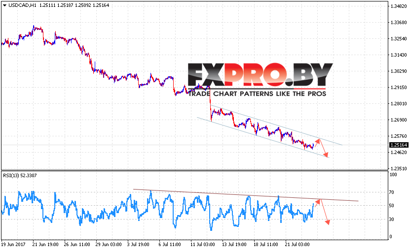 Таким образом, USD/CAD прогноз Канадского Доллара на 26 июля 2017 предполагает попытку коррекции в область верхней границы канала и продолжения снижения в область ниже уровня 1.2450, дополнительным сигналом станет тест линии на индикаторе относительной силы.