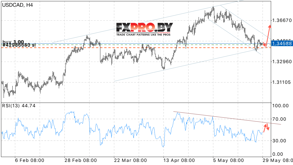 Валютная пара Канадский Доллар к Доллару США USD/CAD продолжает движение в рамках формирования восходящей Форекс модели 1:1. На данный момент котировки пары тестируют область нижней границы восходящего канала, стоит ожидать отскок и попытку роста USD/CAD в область выше уровня 1.36.