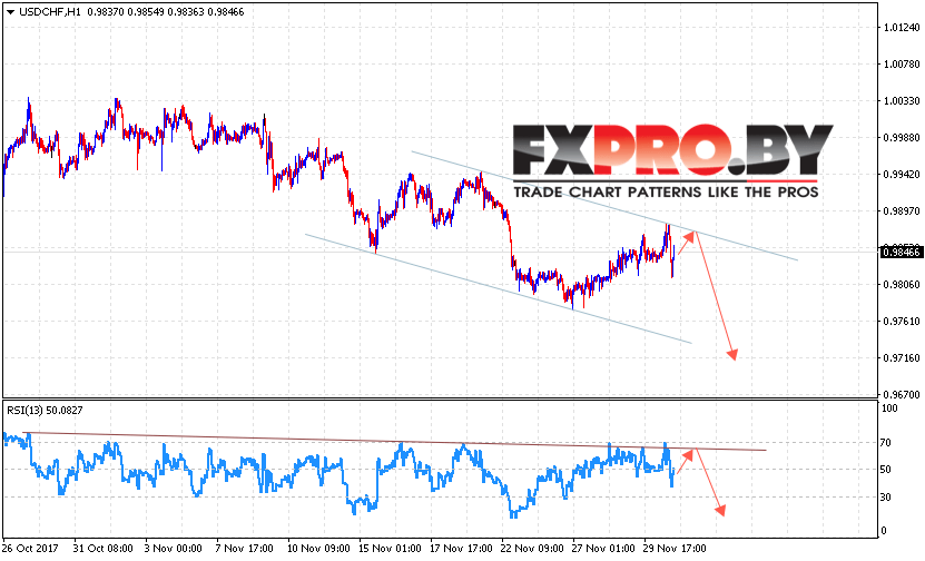 Таким образом, USD/CHF прогноз Доллар Франк на 1 декабря 2017 предполагает попытку теста верхней границы канала вблизи 0.9865 и продолжение падения пары в область ниже уровня 0.9720, дополнительным сигналом в пользу падения пары Доллара Франк выступит тест нисходящей линии тренда на индикаторе относительной силы.