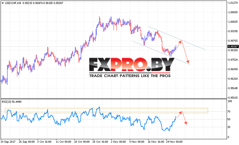 Таким образом, USD/CHF прогноз Доллар Франк на 29 ноября 2017 предполагает попытку теста верхней границы канала вблизи 0.9875 и продолжение падения пары в область ниже уровня 0.9700, дополнительным сигналом в пользу падения пары Доллара Франк выступит тест сопротивления на индикаторе относительной силы.
