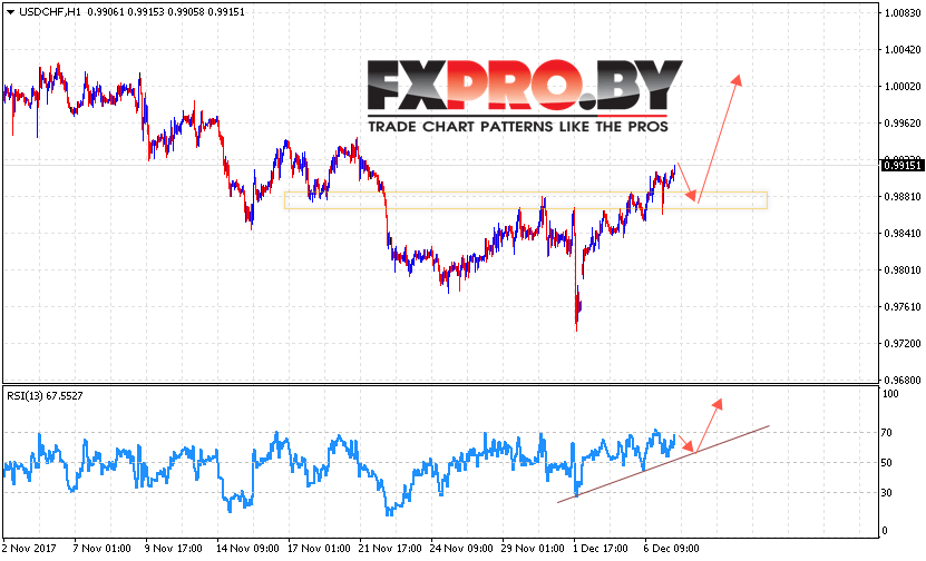 Таким образом, USD/CHF прогноз Доллар Франк на 8 декабря 2017 предполагает попытку теста уровня поддержки вблизи 0.9880 и продолжение роста пары в область выше уровня 1.0020, дополнительным сигналом в пользу роста пары Доллар Франк выступит тест линии поддержки на индикаторе относительной силы.