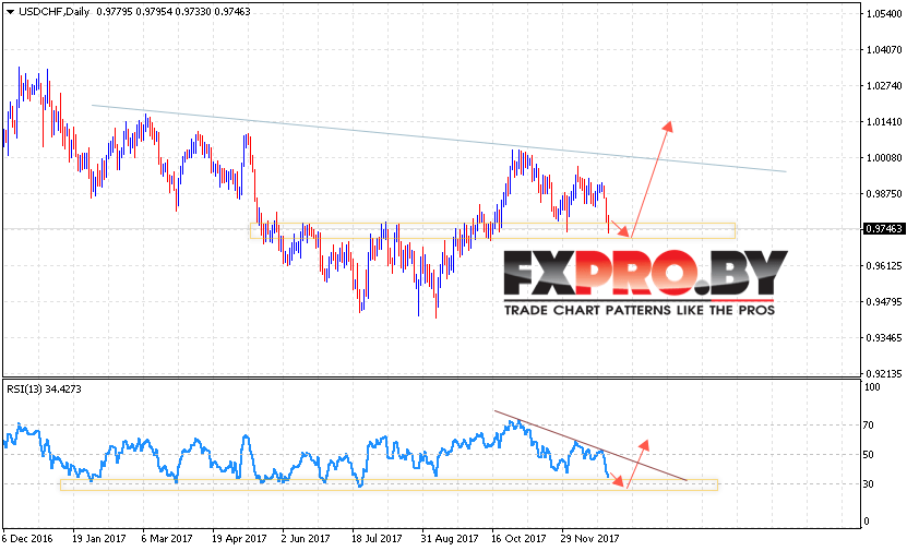 Таким образом, USD CHF прогноз Форекс на неделю 1 — 5 января 2018 предполагает попытку теста уровня поддержки вблизи 0.9710 и начала роста USD/CHF в область выше уровня 1.0140, в пользу роста пары выступает тест области поддержки на индикаторе относительной силы, отменой варианта роста USD/CHF станет пробой уровня 0.9500.