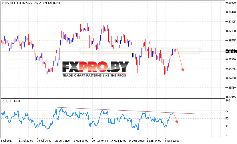 Таким образом, USD/CHF прогноз курс Доллара к Франку на 13 сентября 2017 предполагает попытку падения ниже уровня 0.9475 в рамках отскока от линии сопротивления на индикаторе относительной силы, отменой выступит пробой уровня и закрытие котировок выше 0.9650.