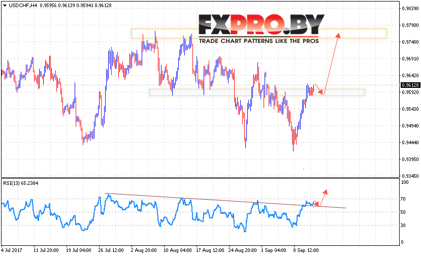 Таким образом, USD/CHF прогноз курс Доллара к Франку на 14 сентября 2017 предполагает попытку роста выше уровня 0.9750 в рамках отскока от уровня поддержки на графике цены, отменой выступит пробой уровня и закрытие котировок ниже области 0.9580.