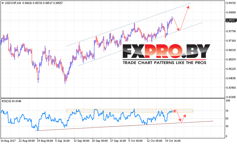 Таким образом, USD/CHF прогноз курс Доллара к Франку на 24 октября 2017 предполагает попытку теста нижней границы канала и продолжения роста выше уровня 0.9970, дополнительным сигналом в пользу роста выступит тест линии тренда на индикаторе относительной силы.