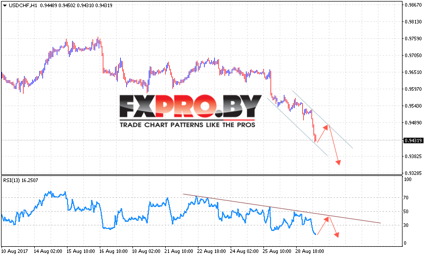 Таким образом, USD/CHF прогноз курс Доллара к Франку на 30 августа 2017 предполагает попытку роста котировок в область верхней границы нисходящего канала вблизи уровня 0.9485, откуда стоит ожидать падения с целью ниже уровня 0.9350, дополнительным сигналом выступит тест линии тренда на индикаторе относительной силы.