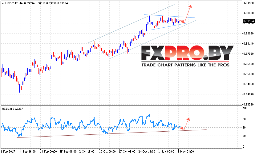 Таким образом, USD/CHF прогноз курс Доллара к Франку на 9 ноября 2017 предполагает попытку отскока от нижней границы модели «Треугольник» и продолжения роста выше уровня 1.0140, дополнительным сигналом в пользу роста пары Доллара Франк выступит тест линии тренда на индикаторе относительной силы, с пробоем верхней границы модели «Треугольник» стоит ожидать ускорения роста пары.