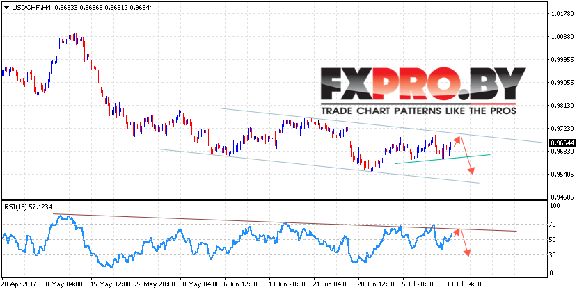 Таким образом, USD/CHF прогноз курса Доллара к Франку на 14 июля 2017 предполагает попытку снижения в область ниже уровня 0.9540 в рамках отработки Форекс модели Голова и плечи, отменой стане пробой уровня 0.9720, что укажет на продолжение роста пары.