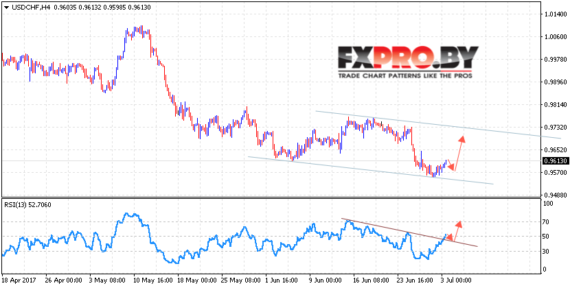 Таким образом, USD/CHF прогноз курса Доллара на 4 июля 2017 предполагает попытку коррекции в область верхней границы нисходящего канала на уровне 0.9720, дополнительным сигналом выступает пробой линии тренда на индикаторе относительной силы, отменой станет пробой области 0.95.