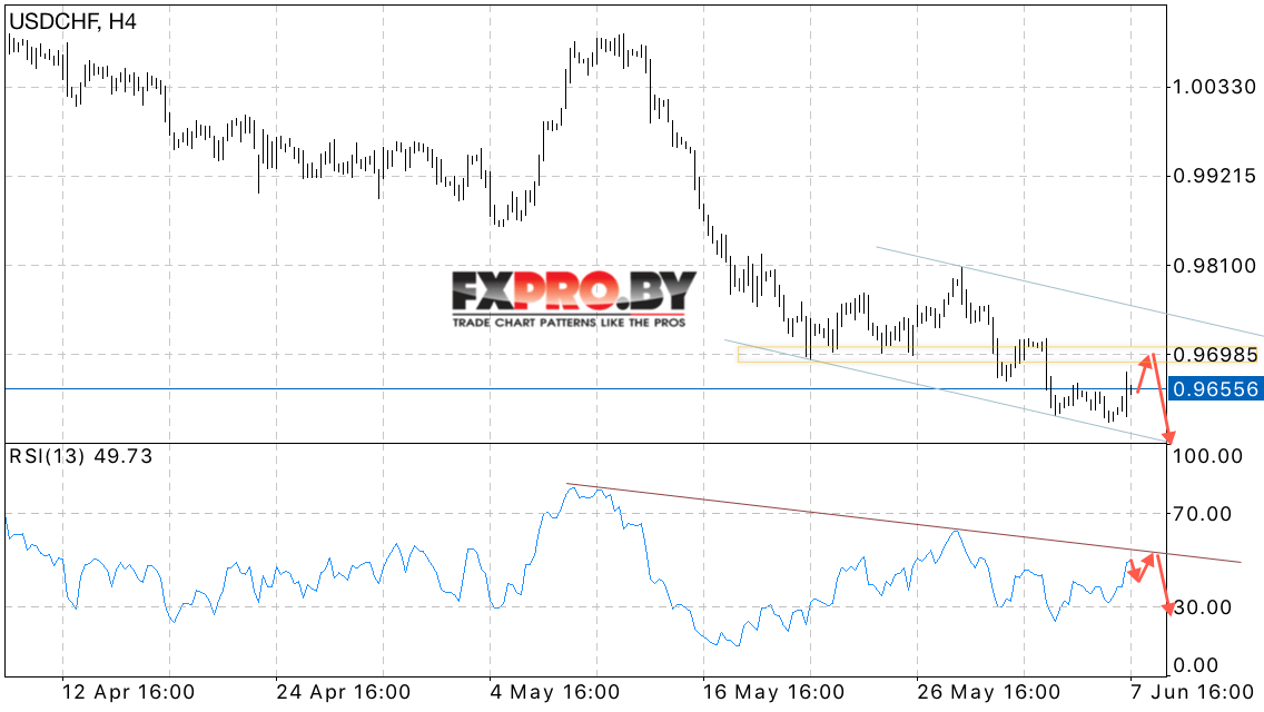 Таким образом, USD/CHF прогноз курса Франка на 8 июня 2017 предполагает попытку коррекции в область 0.97, откуда стоит ожидать продолжения снижения пары с целью ниже области 0.9550, отменой станет пробой области 0.98.