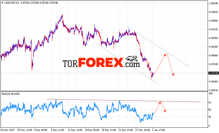 Таким образом, USD/CHF прогноз Доллар Франк на 3 января 2018 предполагает попытку теста верней границы канала вблизи 0.9800 и продолжение падения пары USD/CHF, дополнительным сигналом в пользу падения пары Доллар Франк выступит тест линии тренда на индикаторе относительной силы.