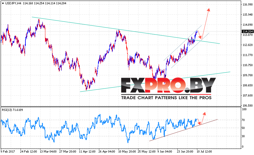 Таким образом, Доллар Иена прогноз Форекс USD JPY на 11 июля 2017 предполагает попытку коррекции в область пробитой границы модели Треугольник и продолжение роста выше уровня 116.00, дополнительным сигналом выступит плотный тест линии поддержки на индикаторе относительной силы.
