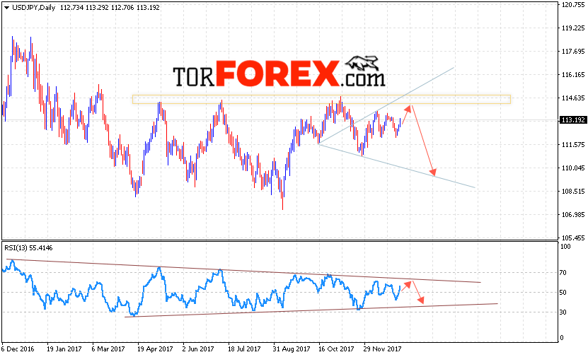 В пользу падения пары Доллар Иена выступит тест линии сопротивления на индикаторе относительной силы. Отменой варианта снижения пары USD/JPY на текущей торговой неделе станет сильный рост и пробой области 115.50, что укажет на продолжение роста пары на Форекс.