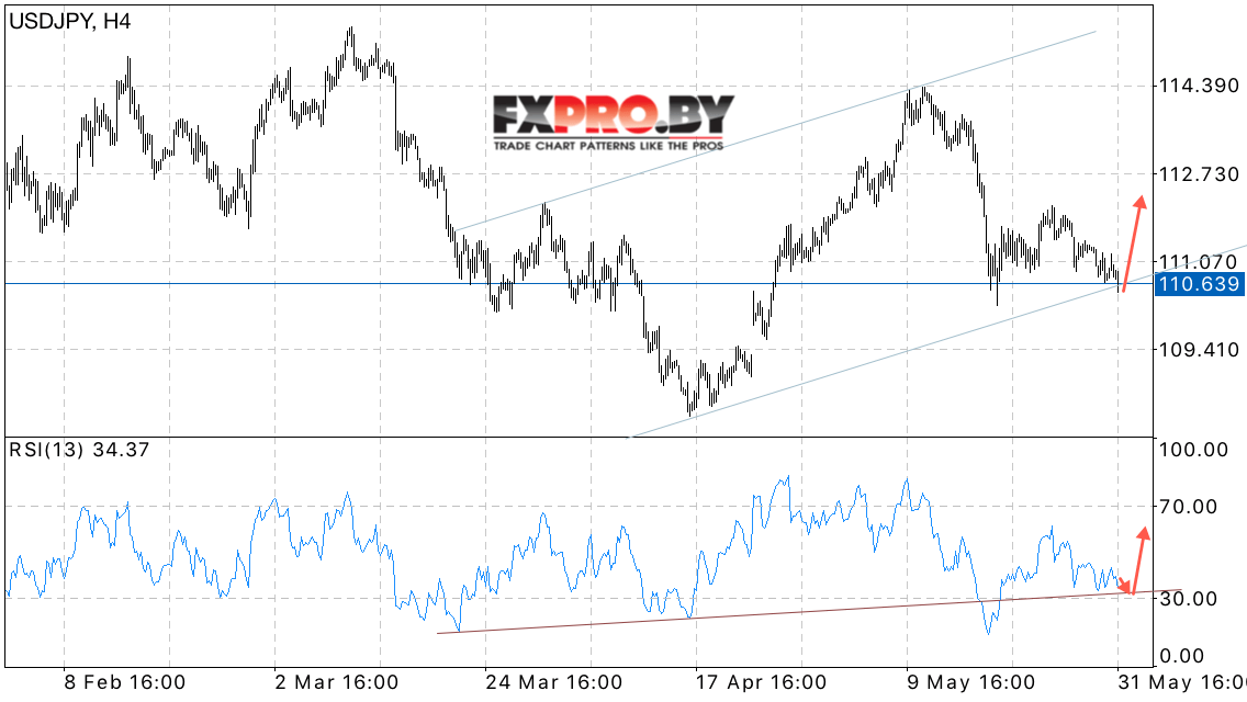 Котировки валютной пары Доллар Иена USD/JPY продолжает движение вблизи нижней границы восходящей Форекс модели 5-0. Стоит ожидать попытку отскока и продолжения роста с потенциальной целью выше области 114.50.