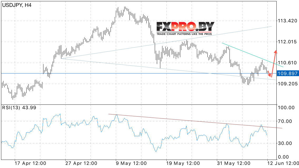 Таким образом, USD/JPY прогноз курса Доллара к Иене на 13 июня 2017 предполагает попытку падения в область 109.50 и начала роста в рамках отработки разворотной модели, отменой станет пробой области локального минимума, что укажет на продолжение снижения котировок пары.