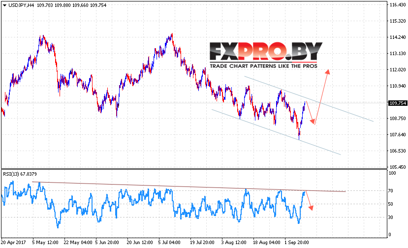 Таким образом, USD/JPY прогноз курса Доллара к Иене на 13 сентября 2017 предполагает попытку теста области 108.50 и начала роста выше уровня 112.00 в рамках отработки разворотной модели Голова и плечи.