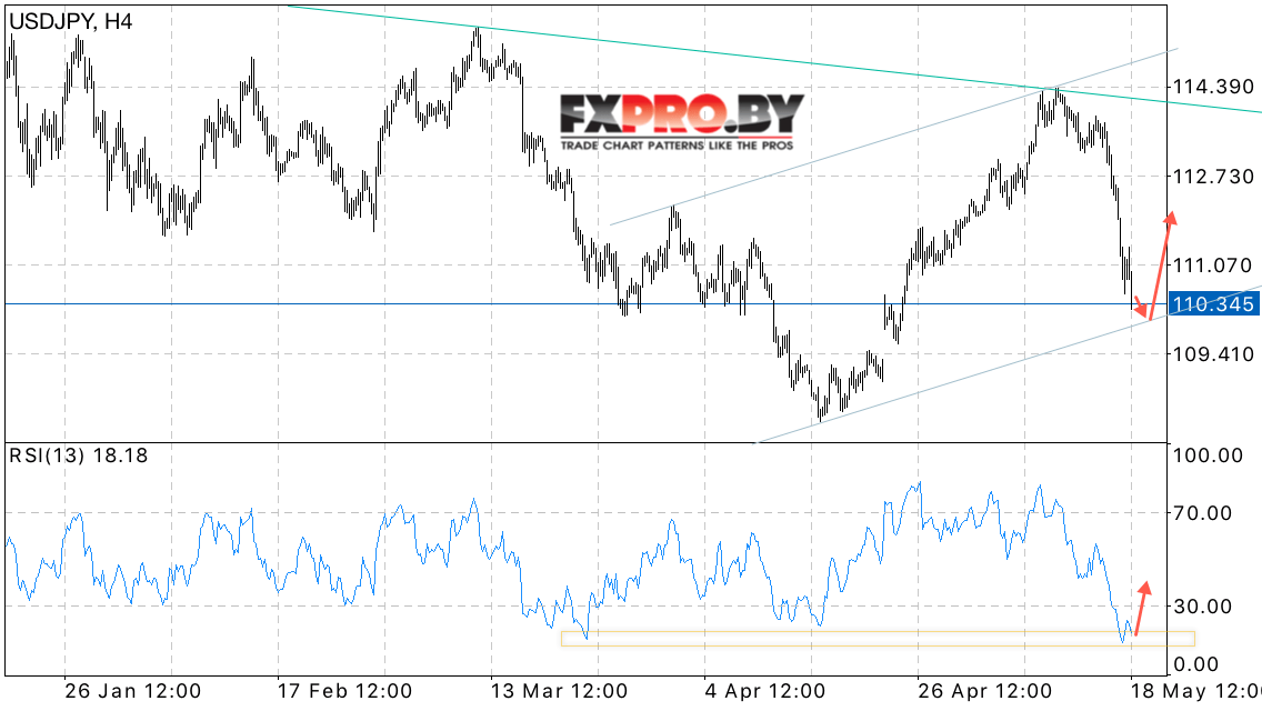 На данный момент стоит ожидать тест нижней границы восходящего канала и начала роста пары USD/JPY. В пользу отскока котировок выступает тест области поддержки на индикаторе относительной силы. Отменой варианта роста пары Доллар Иена станет падение и пробой области 109.50, что укажет на продолжение снижения котировок USD/JPY.