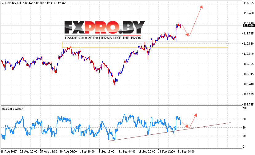 Таким образом, USD/JPY прогноз курса Доллара к Иене на 22 сентября 2017 предполагает попытку падения котировок пары Доллар Иена в область нижней границы восходящего канала вблизи уровня 110.50, откуда стоит ожидать отскок и продолжение роста пары, отменой выступит пробой области 112.00, что укажет на продолжение роста.