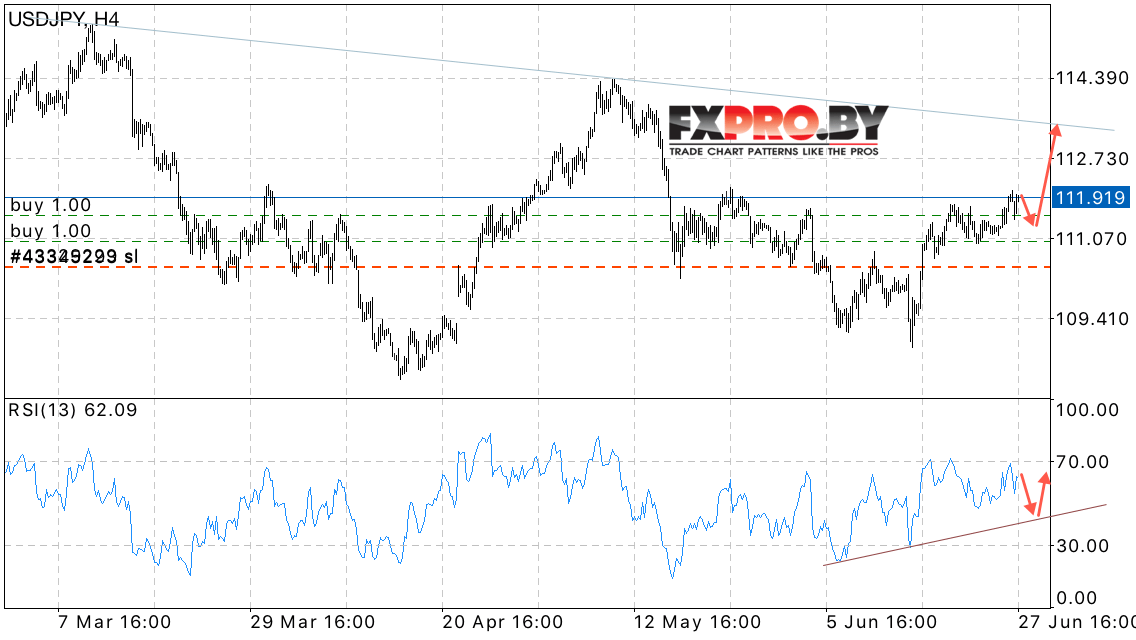 Таким образом, USD/JPY прогноз курса Доллара к Иене на 28 июня 2017 предполагает попытку продолжения роста в область выше уровня 112.80 после теста уровня 111.30, дополнительным сигналом выступит тест линии тренда на индикаторе относительной силы.