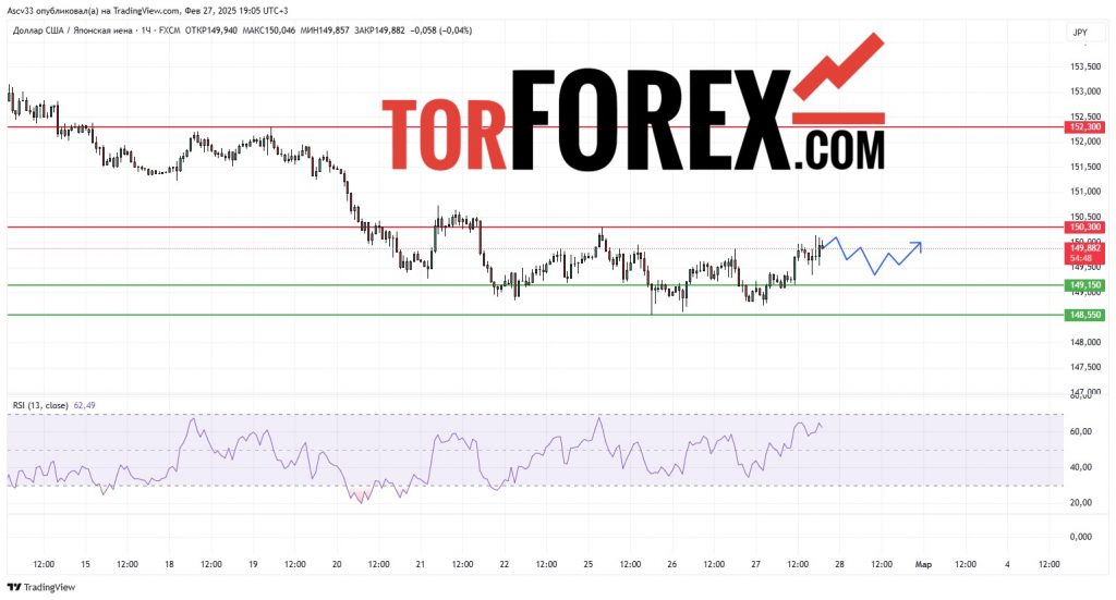 В ближайшие сутки пара USD/JPY, вероятно, будет колебаться в диапазоне 148,55–150,30. Трейдерам рекомендуется внимательно следить за реакцией цены на уровень 148,55: его пробой вниз может усилить медвежьи настроения, тогда как удержание и рост выше 149,71 могут указывать на возможное восстановление.