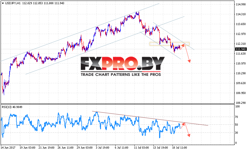 Таким образом, USD/JPY прогноз на 20.07.2017 предполагает попытку продолжения снижения с потенциальной целью на уровне ниже области 110.95, дополнительным сигналом выступает тест линии тренда на индикаторе относительной силы.